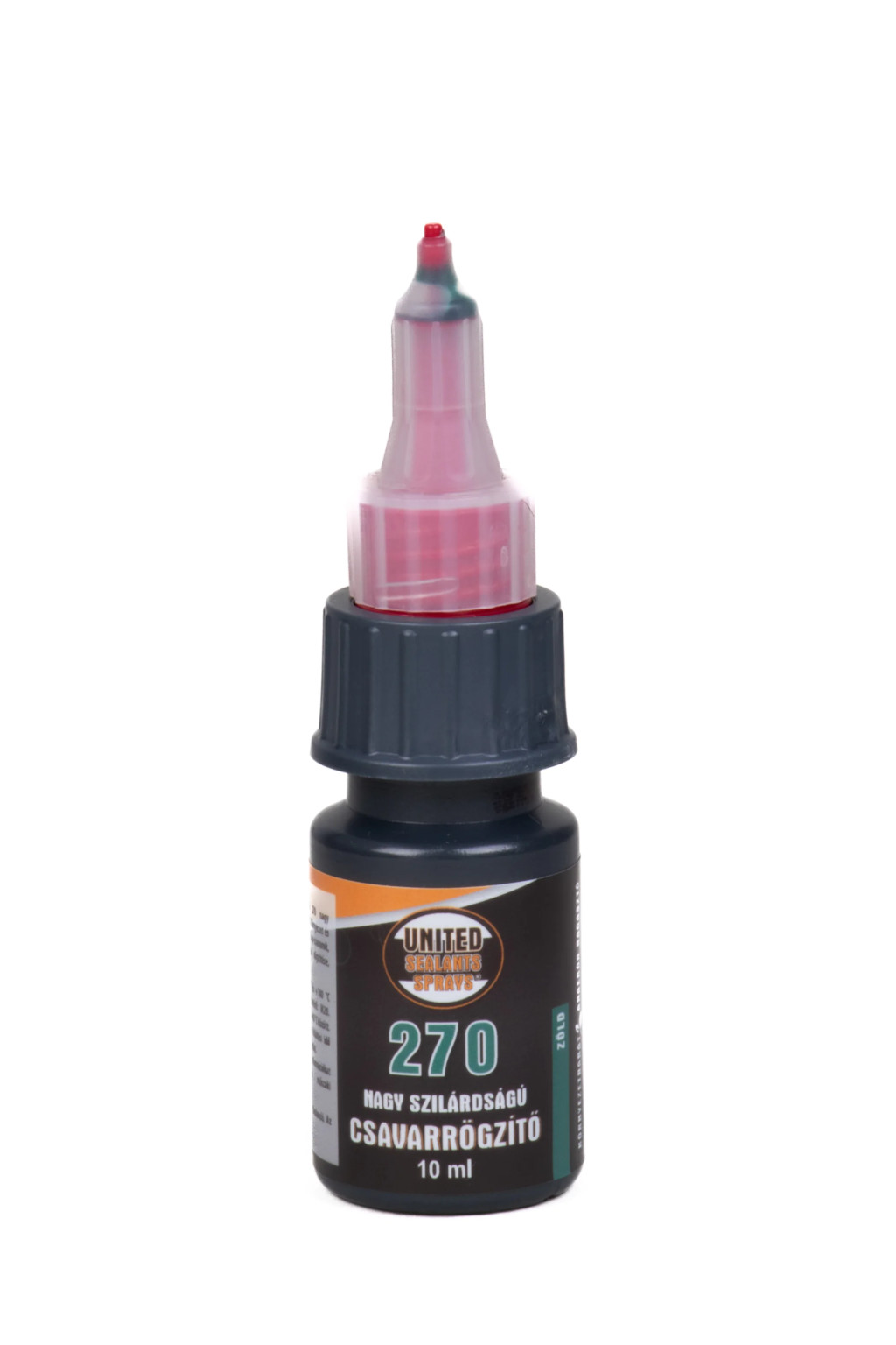 United Sealants Csavarrögzítő 270 termék nagy hőtűrési képességű, nagy szilárdságú ragasztó és tömítő. Légköri oxigén hiányában (anaerob) és a fém katalitikus hatására (fémmel érintkezve) térhálósodik (polimerizálódik), zöld menetrögzítő fémanyagok rögzítésére és tömítésére. A hagyományos anaerob ragasztókhoz képest a termék teljesen „címke” mentes. A 12 hónap helyett 24 hónapig terjedő, hosszabb eltarthatóság mellett jobb tárolási stabilitást, valamint +180°C-os hőmérsékletállóságot is kínál a felhasználónak.