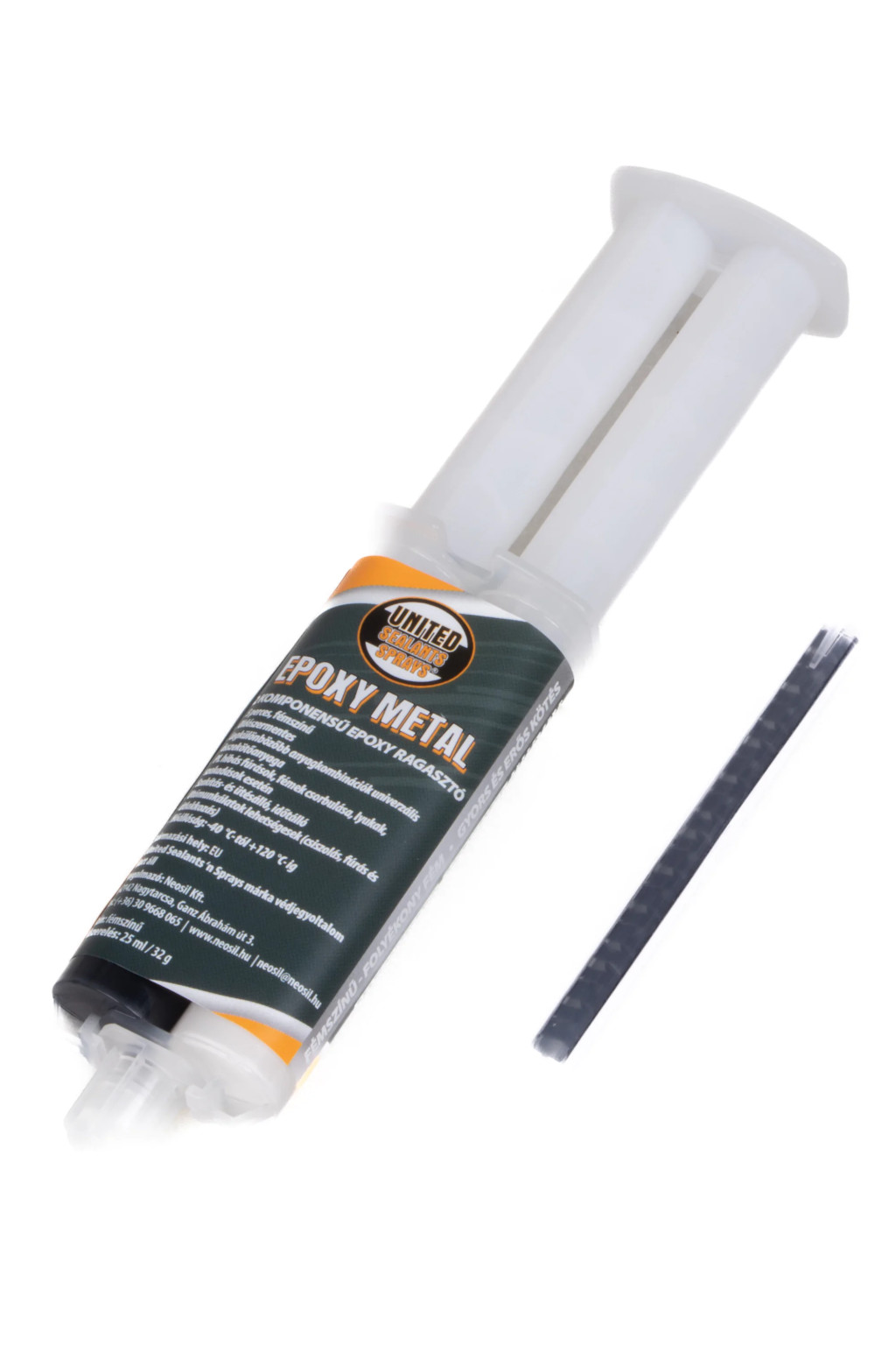 A United Sealants Epoxy Metal folyékony fém egy 2 komponensű, gyorskötésű (5perc), nagy szakítószilárdságú, fémszínű, oldószermentes ragasztó.Kitűnő ragasztóerő nagyon sok anyagnál, pl. alumínium, réz, acél, sárgaréz, beton, FK/SMC, fa, üveg, műanyag, kerámia, festett fém, grafit, poliuretán, galvanizált fém, kemény műanyag, gumi, bőr stb. Kivéve: PP, PE, PTFE.